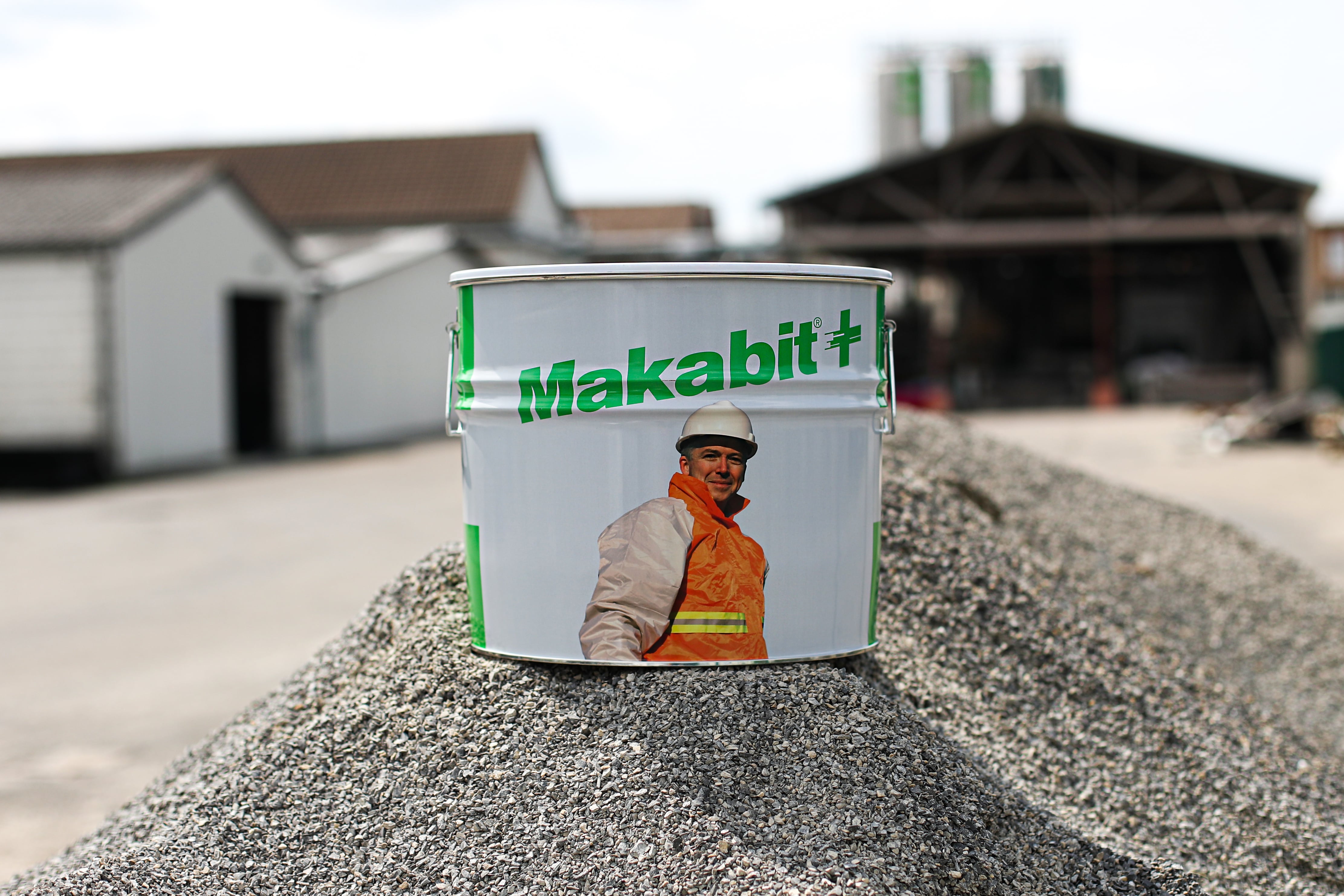 Makabit+ wird direkt aus dem Gebinde in das Schlagloch gefüllt und gleichmäßig, etwas über- höht verteilt. Danach provisorisch festklopfen und mit Rüttelplatte oder Stampfer verdichten. Nachdem die ausgebesserte Stelle mit Sand abgestreut wurde, ist sie sofort befahrbar. Die endgültige Verdichtung besorgt der Straßenverkehr.
